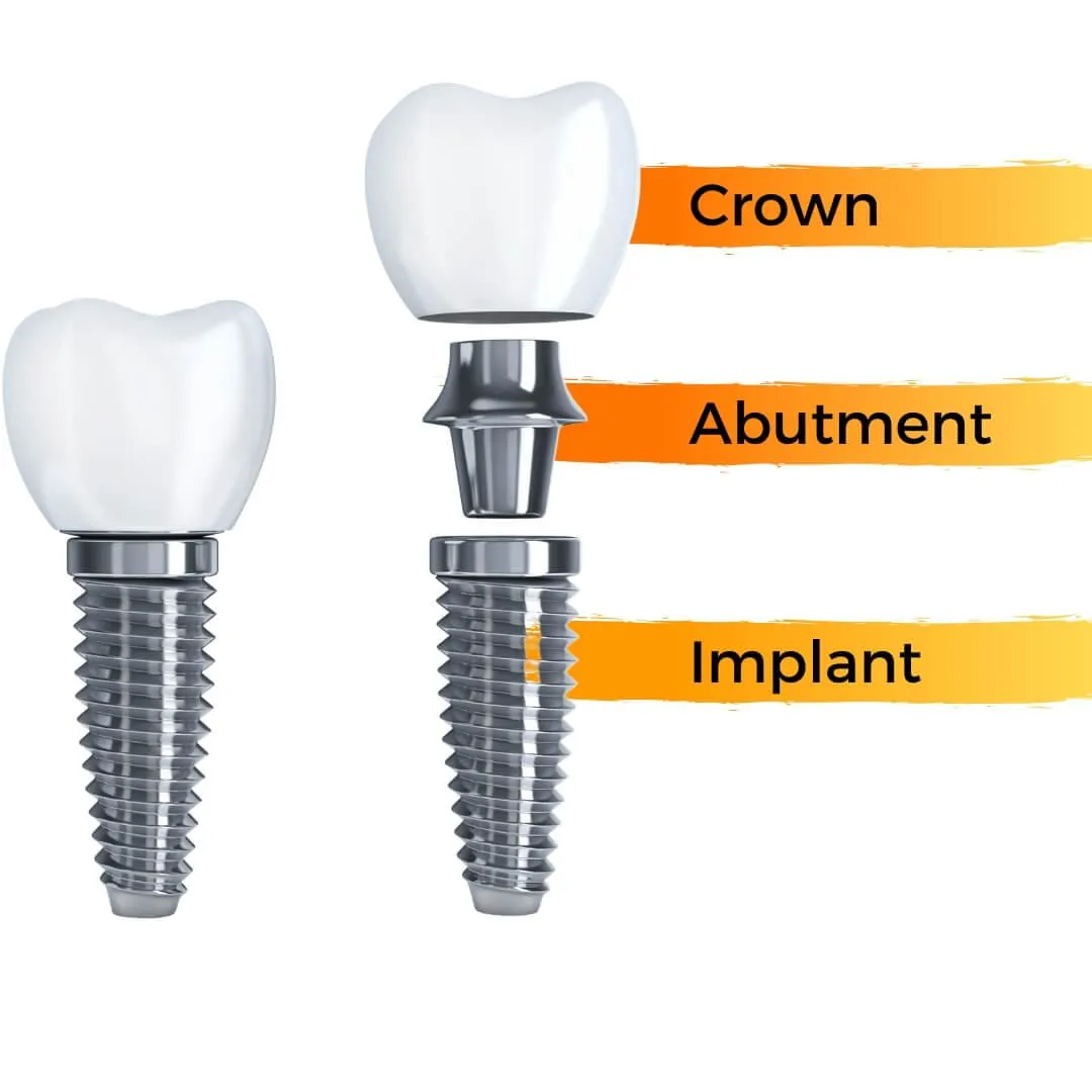 Every single dental implant consists of three parts - the implant, the abutment, & the crown. The implant is made of medical grade titanium. This part is surgically placed into the patient’s jaw bone and left to heal for 4-6 months afterwards.